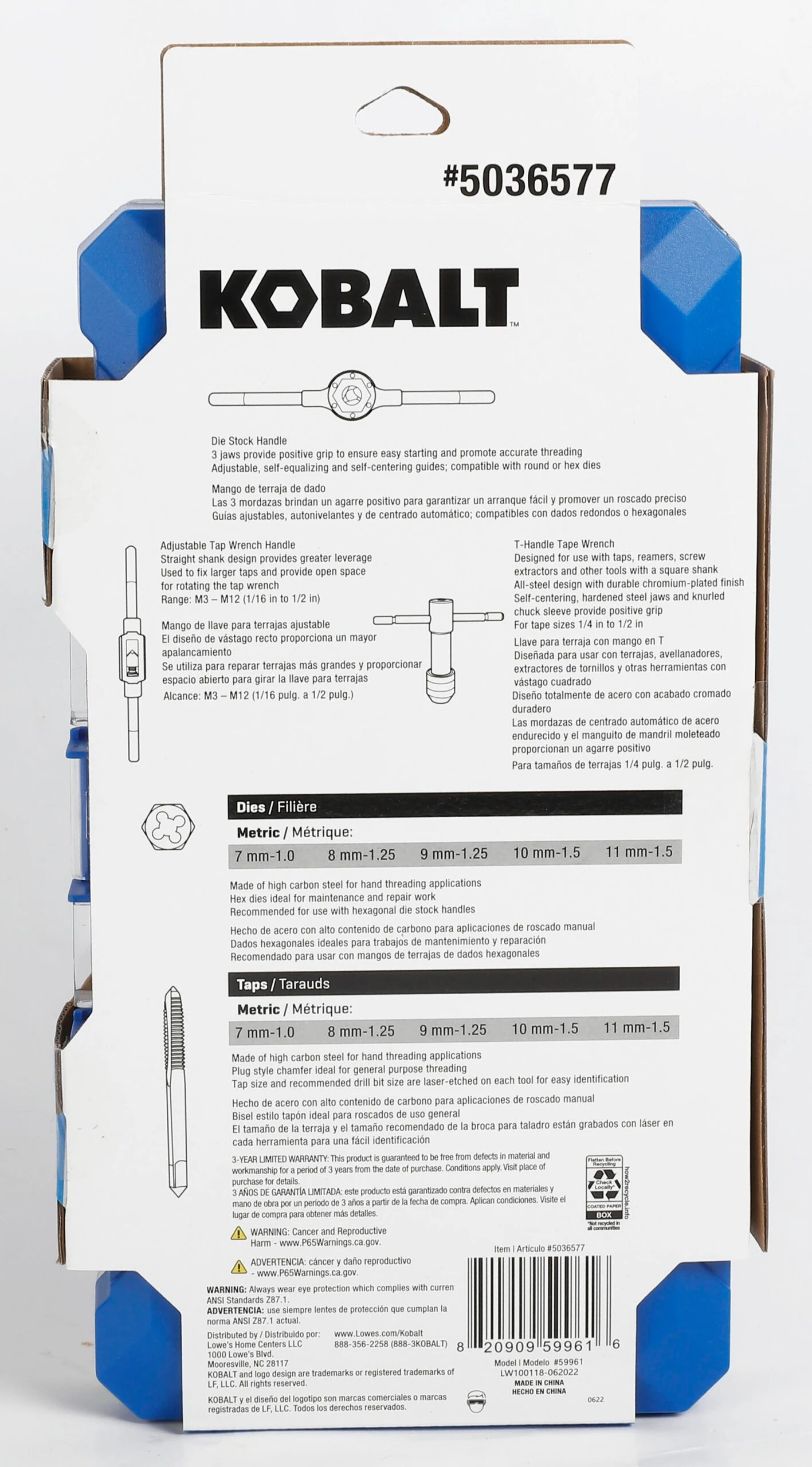 • This set includes tap and die 7 mm, 8 mm, 9 mm, 10 mm, 11 mm, 1pc die stock, 1pc adjustable tap socket and 1pc T-handle tap wrench