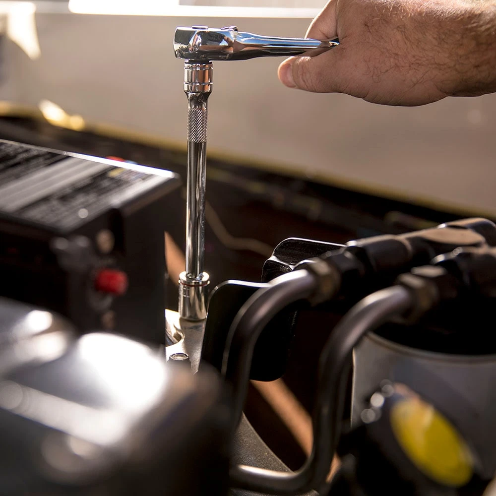 Quick-release button on ratchets allows for rapid socket and/or accessory change