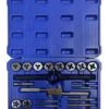 This set includes: tap and die: 1/4 in-20NC, 1/4 in-28NF, 5/16 in-18NC, 5/16 in-24NF, 3/8 in-16NC, 3/8 in-24NF, 7/16 in-14NC, 7/16 in-20NF, 1/2 in-13NC, 1/2 in-20NF, pipe: 1/8 in-27NPT, 1pc die stock, 1pc adjustable tap socket