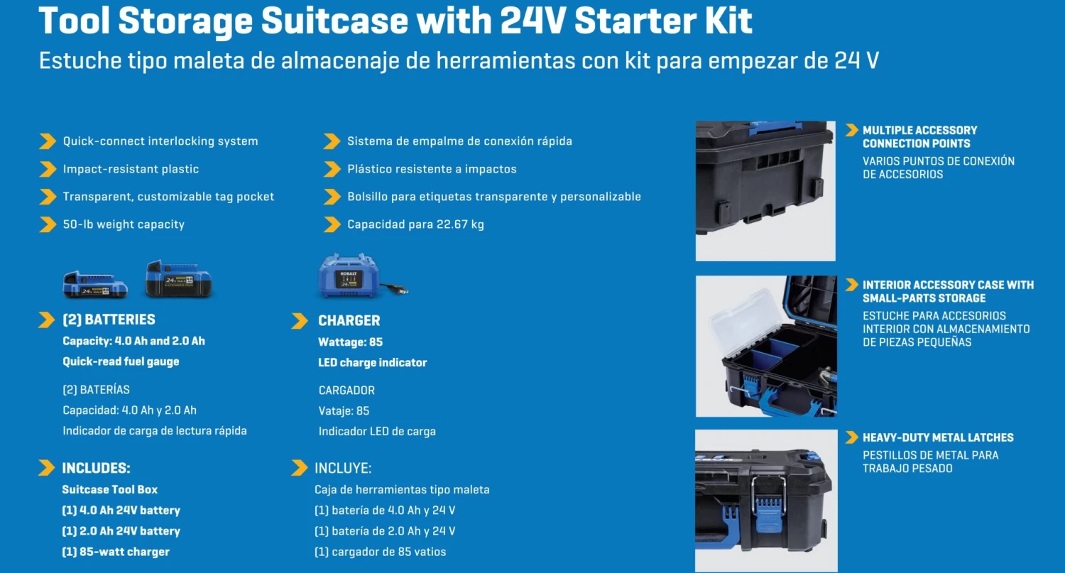 • Kobalt’s 24-volt starter kit includes: a 2.0Ah battery, a 4.0Ah battery, an 85-Watt charger, and a CASESTACK storage box