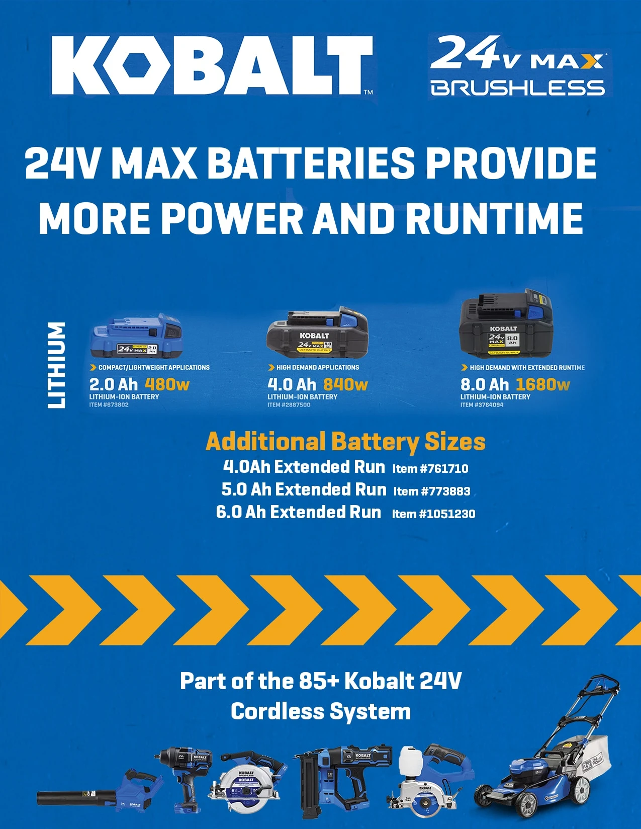 Convenient 2-pack that is compatible with all Kobalt 24-volt max cordless power tools (sold separately)