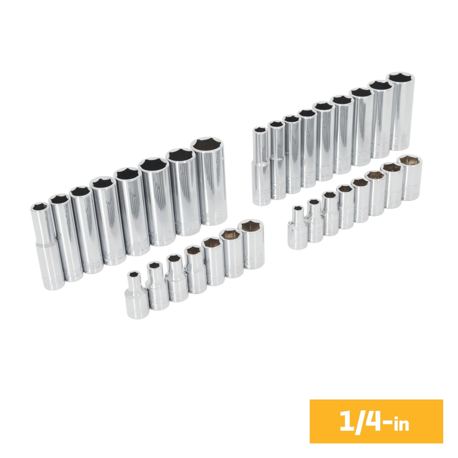 This set includes: 32 – 1/4-in drive sockets, 12- 3/8-in drive sockets, 1 – 3/8-in x 1/4-in hex bit adapter, and 1 90T standard ratchet