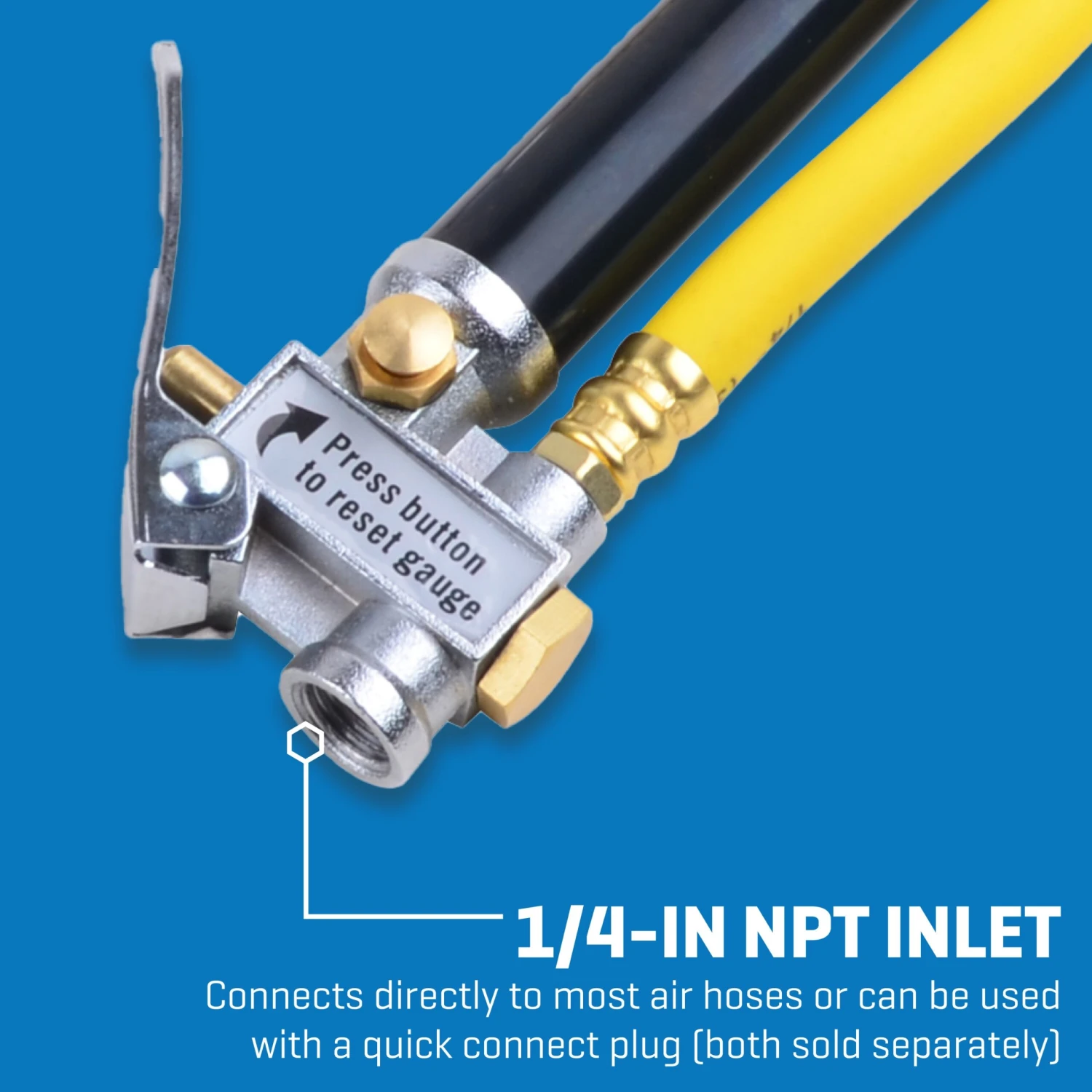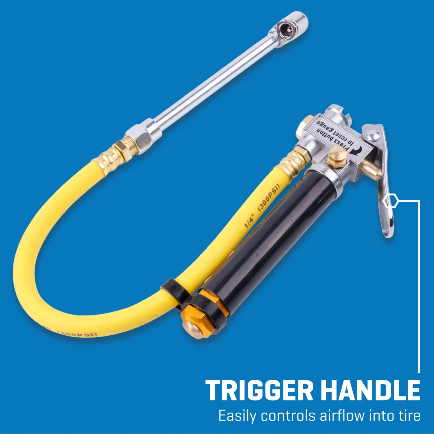 • Designed for easy access, the dual foot chuck allows inflation from both sides, perfect for reaching hard-to-access tire valves on larger vehicles like tractors, trucks, and buses