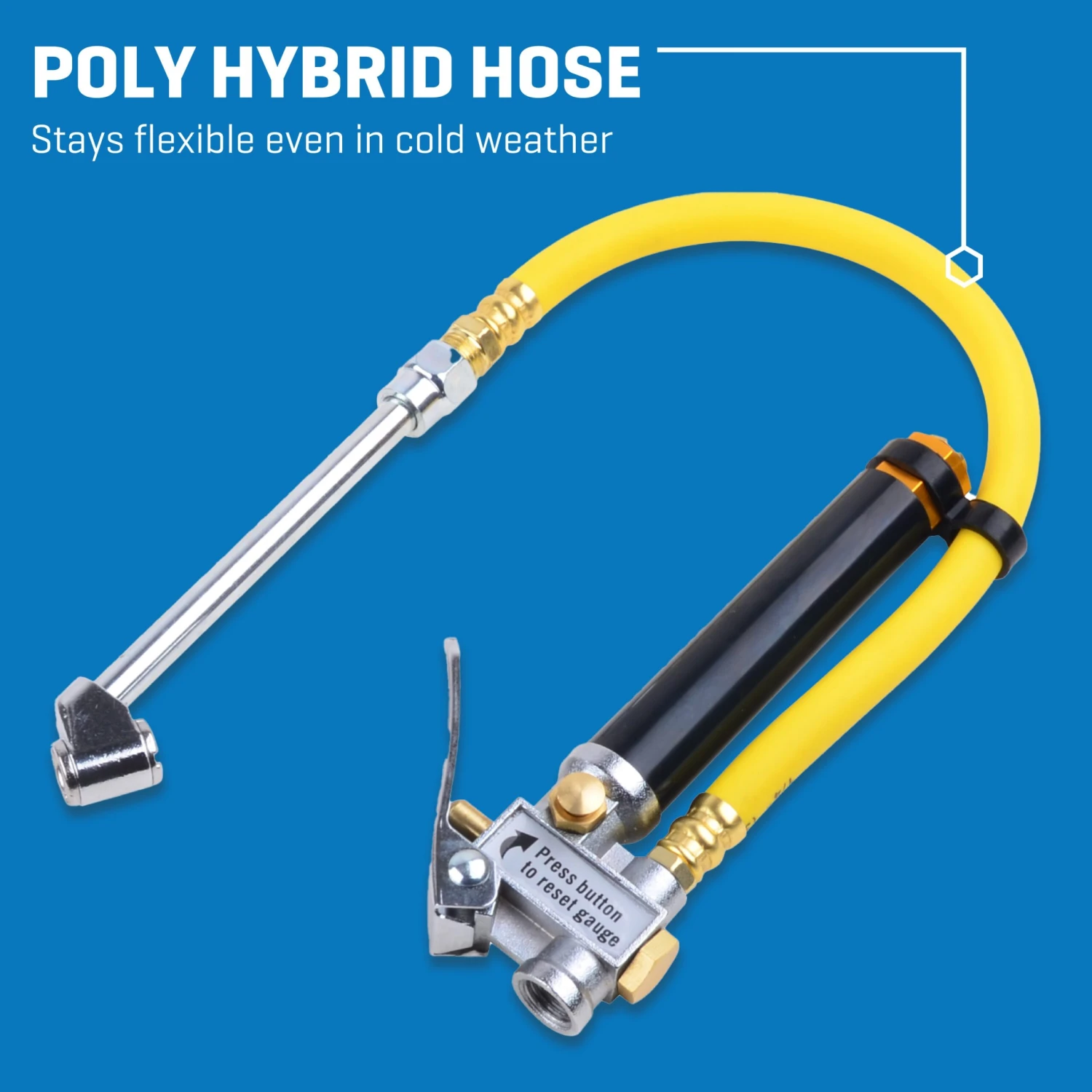 • The poly hybrid inflation hose remains flexible even in cold conditions and features a clip-on chuck for convenient, one-handed operation