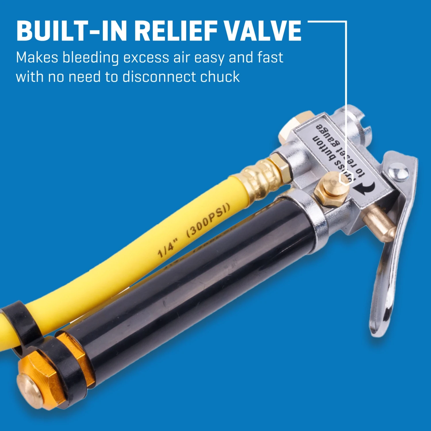 • Easily release excess air with the built-in relief valve, ensuring accurate pressure control and preventing over-inflation without disconnecting the air chuck