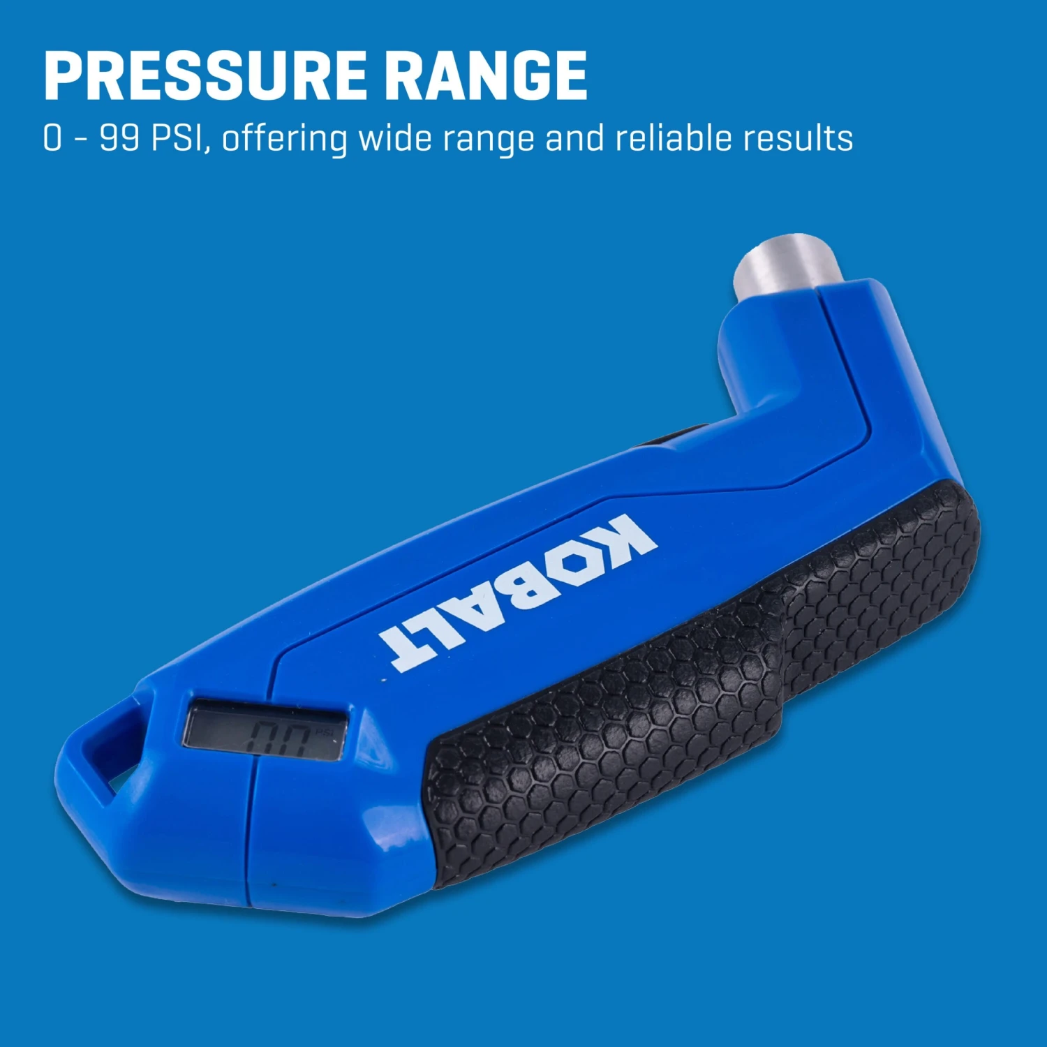 The Kobalt Digital Tire Gauge is the perfect tool for quick and easy tire maintenance. With an ergonomic pistol grip, our digital tire gauge provides an intuitive and comfortable experience that makes checking your tire pressure a breeze. The illuminated LED display on both sides enables you to read your tire’s PSI reading easily and accurately, no matter the lighting conditions. With a broad range of 0-99 PSI and dependable accuracy, this gauge is a reliable tool for ensuring that your tires are always inflated to the correct pressure. Worrying about battery life is a thing of the past because the display panels shut-off automatically after approximately 30 seconds to conserve energy. The gauge comes with 2 AAA batteries included, making it ready to use right out of the package. And when it’s time for a replacement, swapping out the batteries is a simple process. It also comes equipped with an air release button, allowing you to bleed off excess pressure with ease. And with an operating temperature range of 0 – 150 degrees F (-18 to 50 degrees C), our digital tire gauge is built to work in year-round weather temperatures. The Kobalt Digital Tire Gauge allows you to enjoy the benefits of keeping your tires at the ideal pressure level, prolonging tire life, and increasing fuel efficiency.