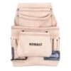 This carpenter’s pouch has multiple pockets and sleeves to hold nails and tools and includes a steel hammer holder.