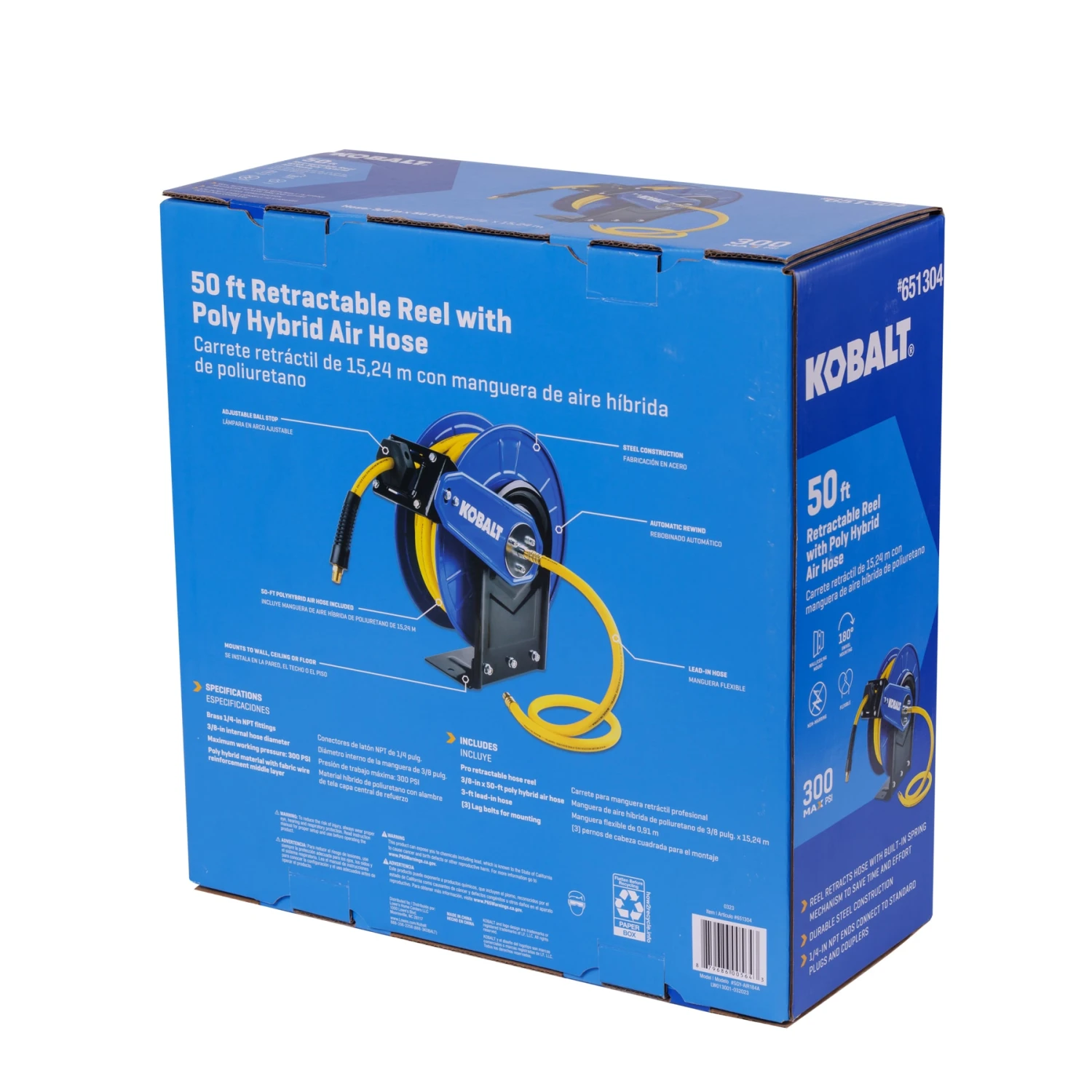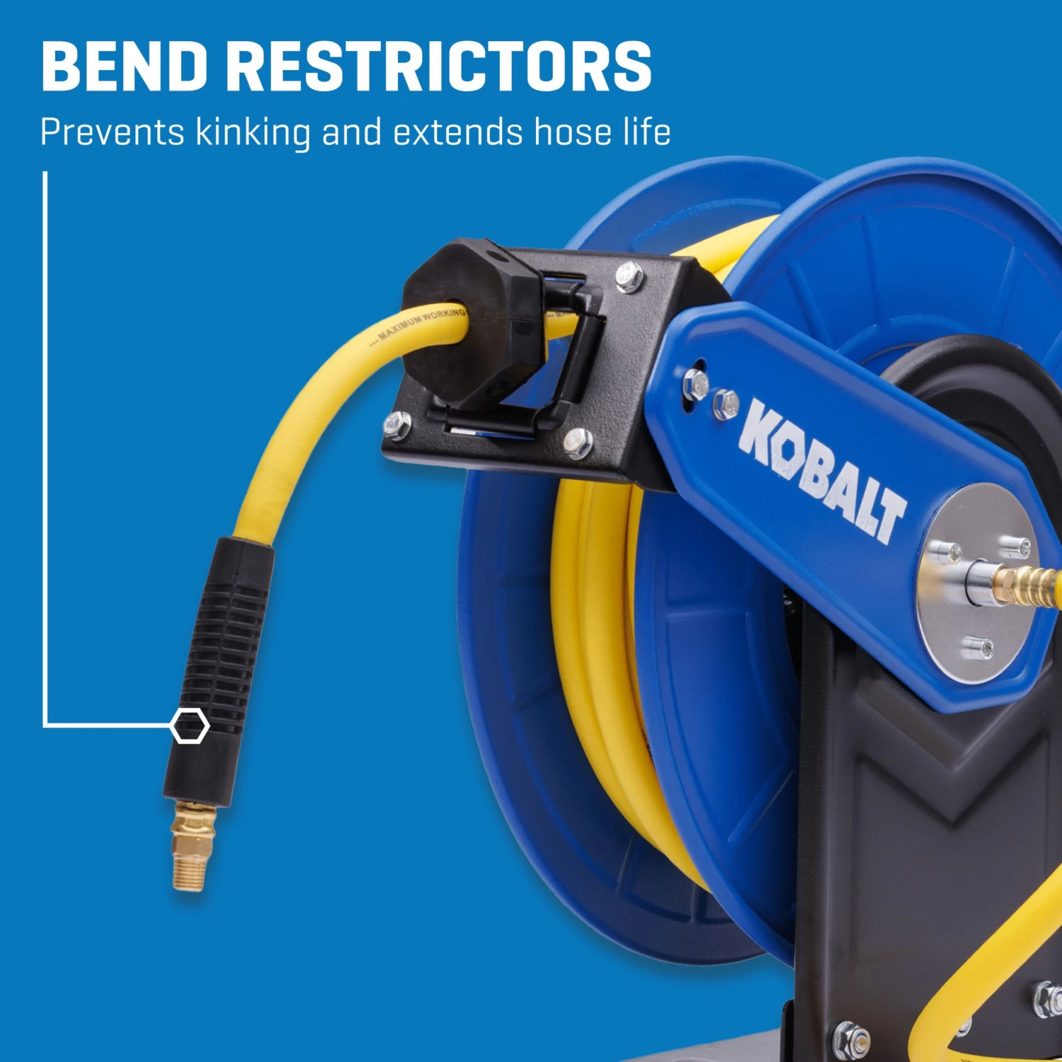 The Kobalt Retractable Hose Reel with 3/8-in x 50-ft Hybrid Hose is the ideal solution for hassle-free air hose management. Its built-in spring mechanism saves time, effortlessly retracting the included Kobalt 50-ft x 3/8-in poly hybrid air hose that stays flexible even in cold weather. Hose has built-in bend restrictor that help prevent kinking and increasing the longevity of the hose. Durable steel construction, easy mounting options (floor, wall, or ceiling), and compatibility with 1/4-in NPT fittings make it a reliable and versatile addition to your workspace.