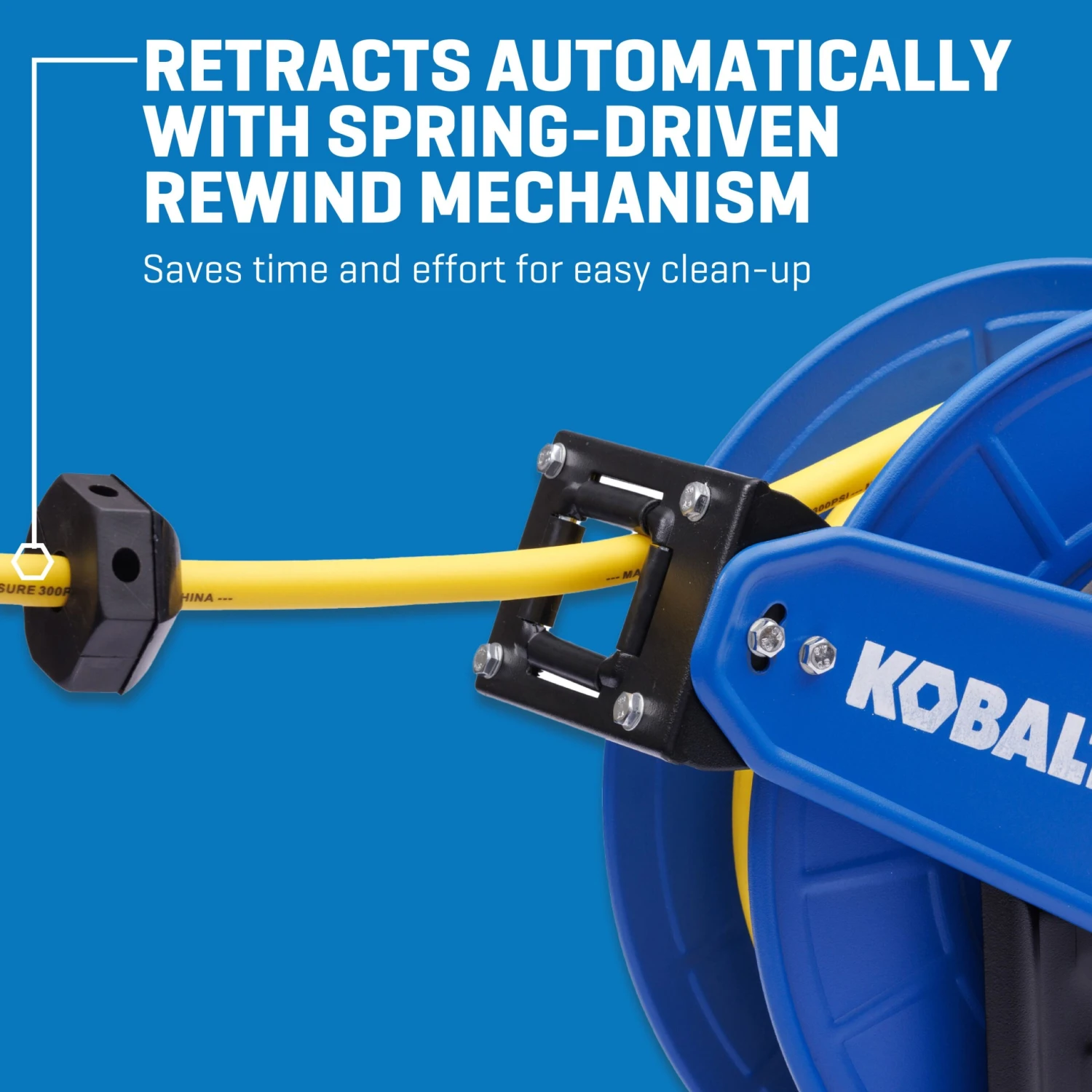 • Reel retracts hose with built-in spring mechanism to save time and effort